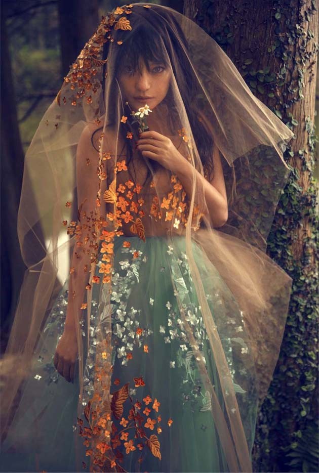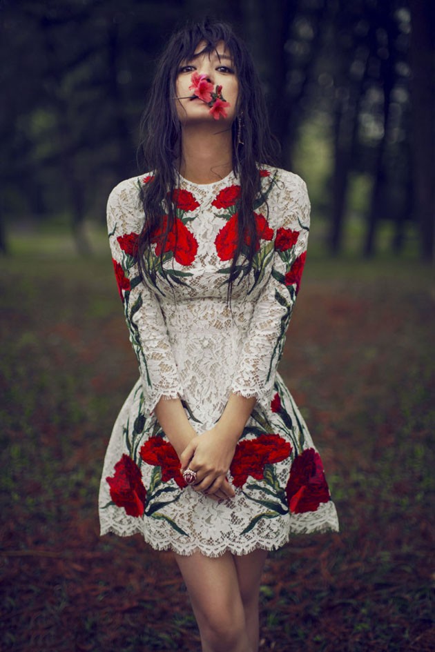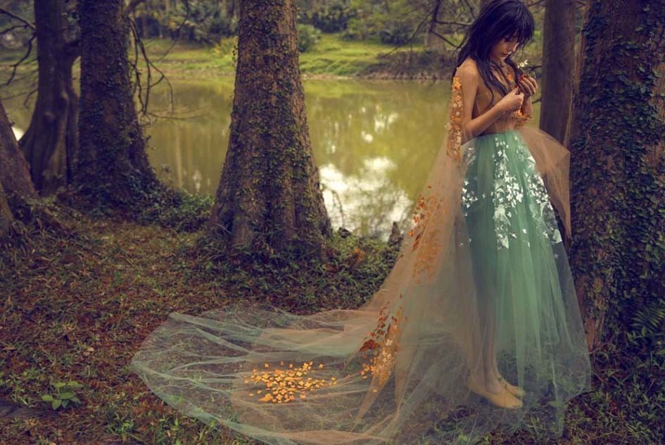 除了特写镜头,整组大片的构图和场景设计也极具心思。赵薇或身穿复古蓝色的挂脖长裙,置身于一片绿意盎然的自然背景中。雾霾蓝的礼服衬托出她雪白的肌肤,而丛林的环境让她宛如一位超然物外的“林中仙子”。在另一场景中,她则尝试了热情的红色网纱裙,散落的发型和标志性的甜美笑容,又瞬间将氛围点燃,展现出明媚如少女般的活力。这种从静谧清纯到热情明媚的跨度,不仅证明了她在镜头前的强大掌控力,也仿佛是她个人生涯从灵动演员到沉稳导演、制片人多重身份的一种隐喻。
