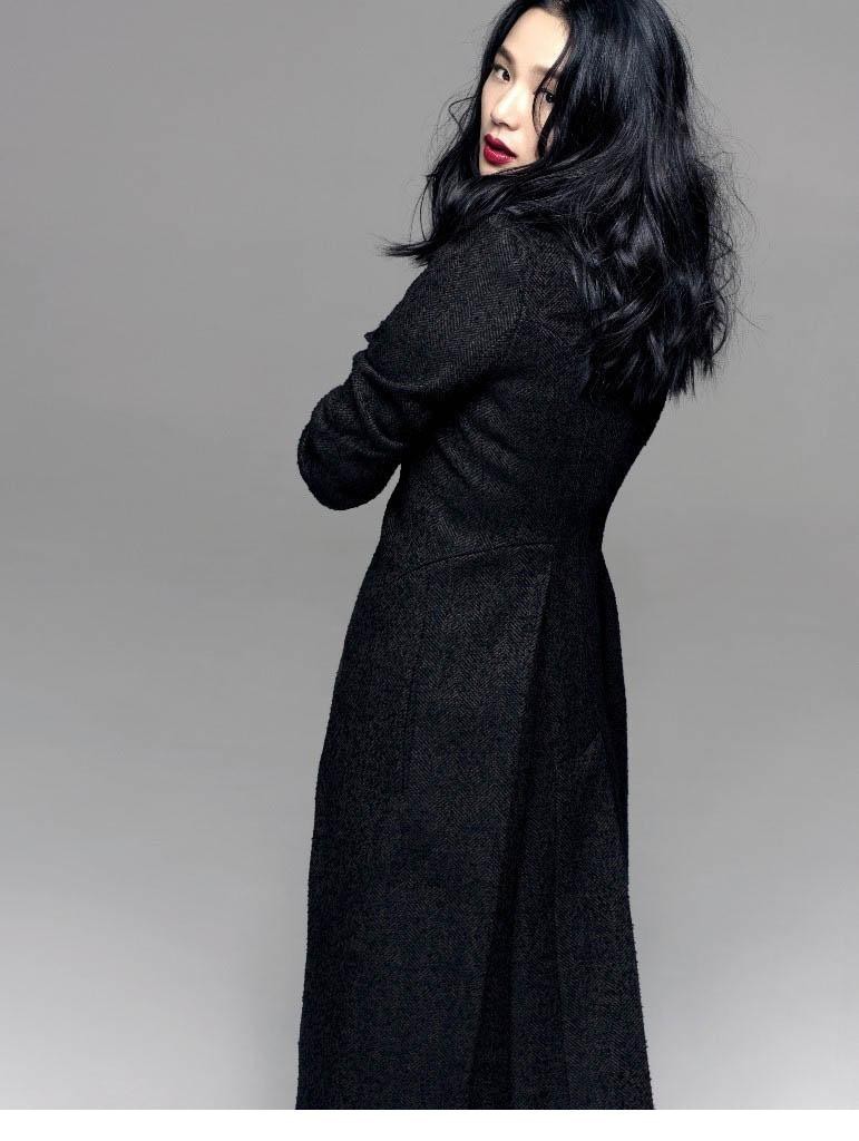 这组写真的精髓在于意境与人物气质的完美交融。其中一张封面,周韵身着简单的纯黑色长裙,静静伫立于一方巨大的砚台之上。画面充满了“所谓伊人,在水一方”的诗意,佳人仿佛从水墨画中走来,周身萦绕着满腹诗书气自华的静谧韵味。黑色长裙的鱼尾和吊带设计,在极致简约中勾勒出她优越的直角肩与优雅体态,彰显出高级的东方美感。