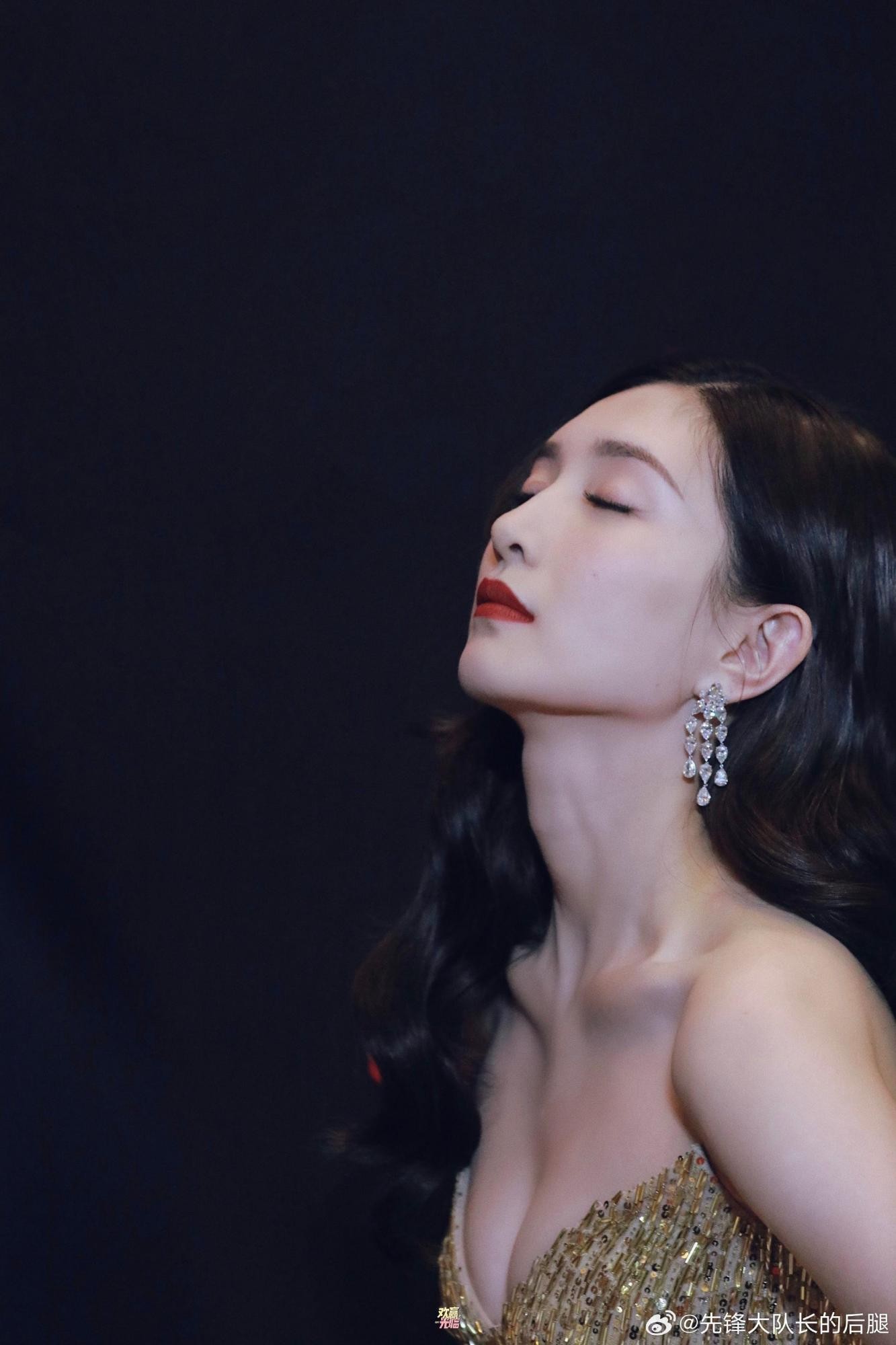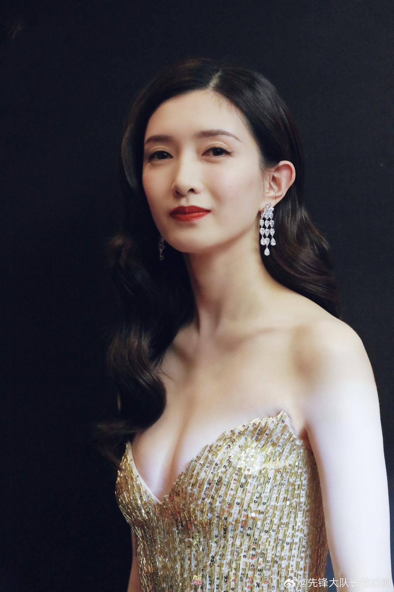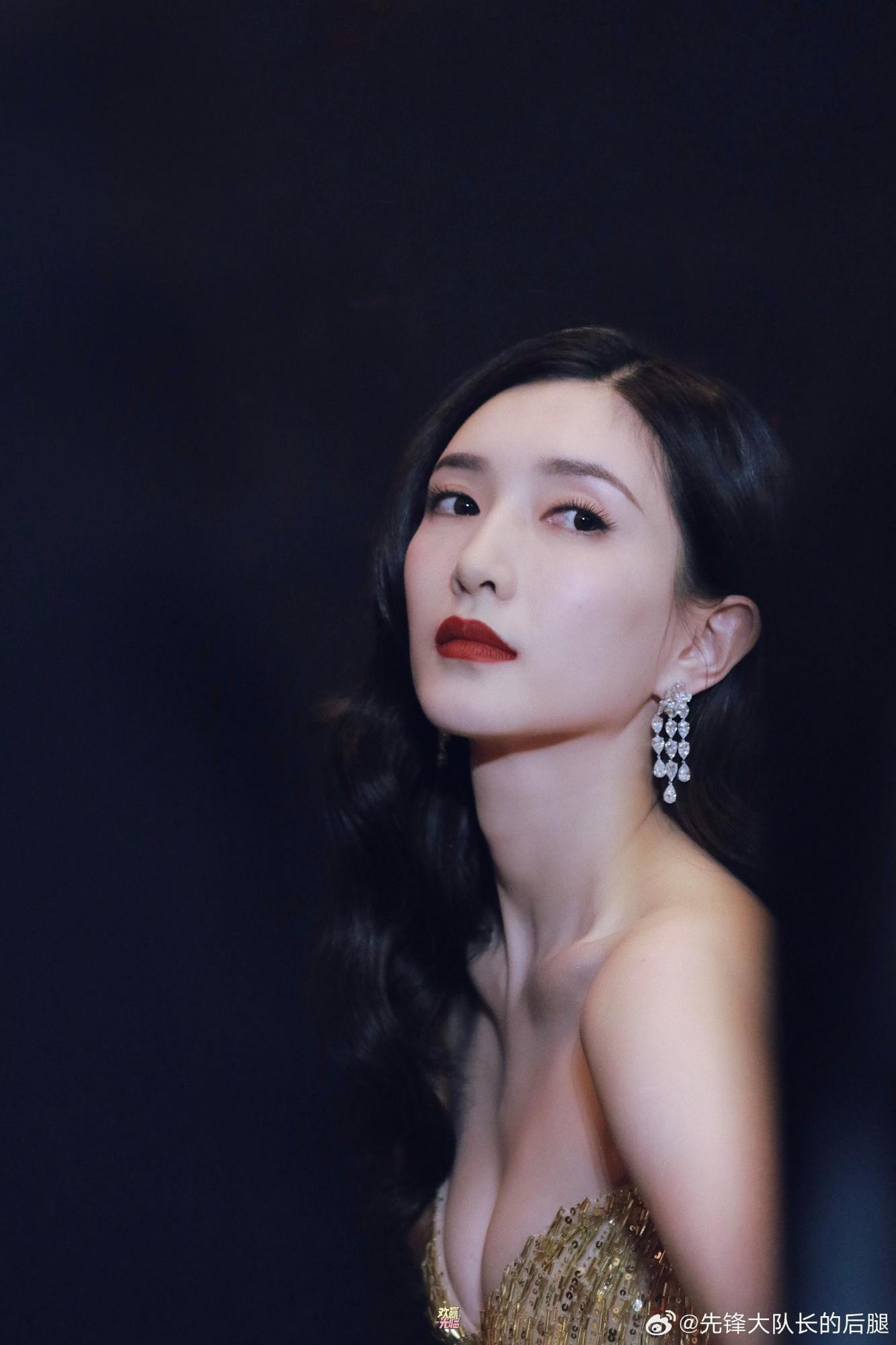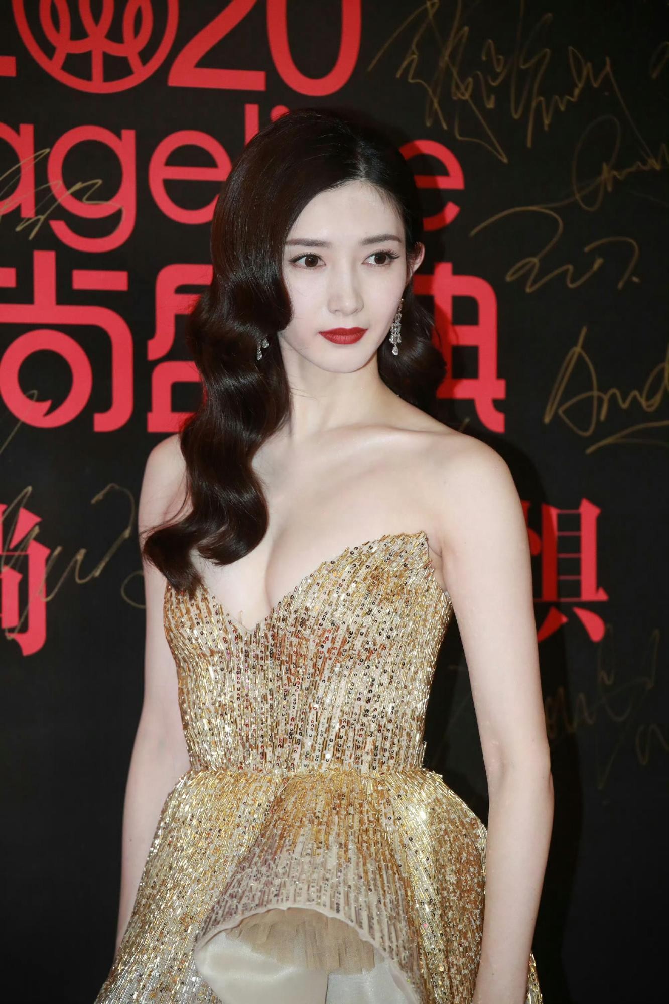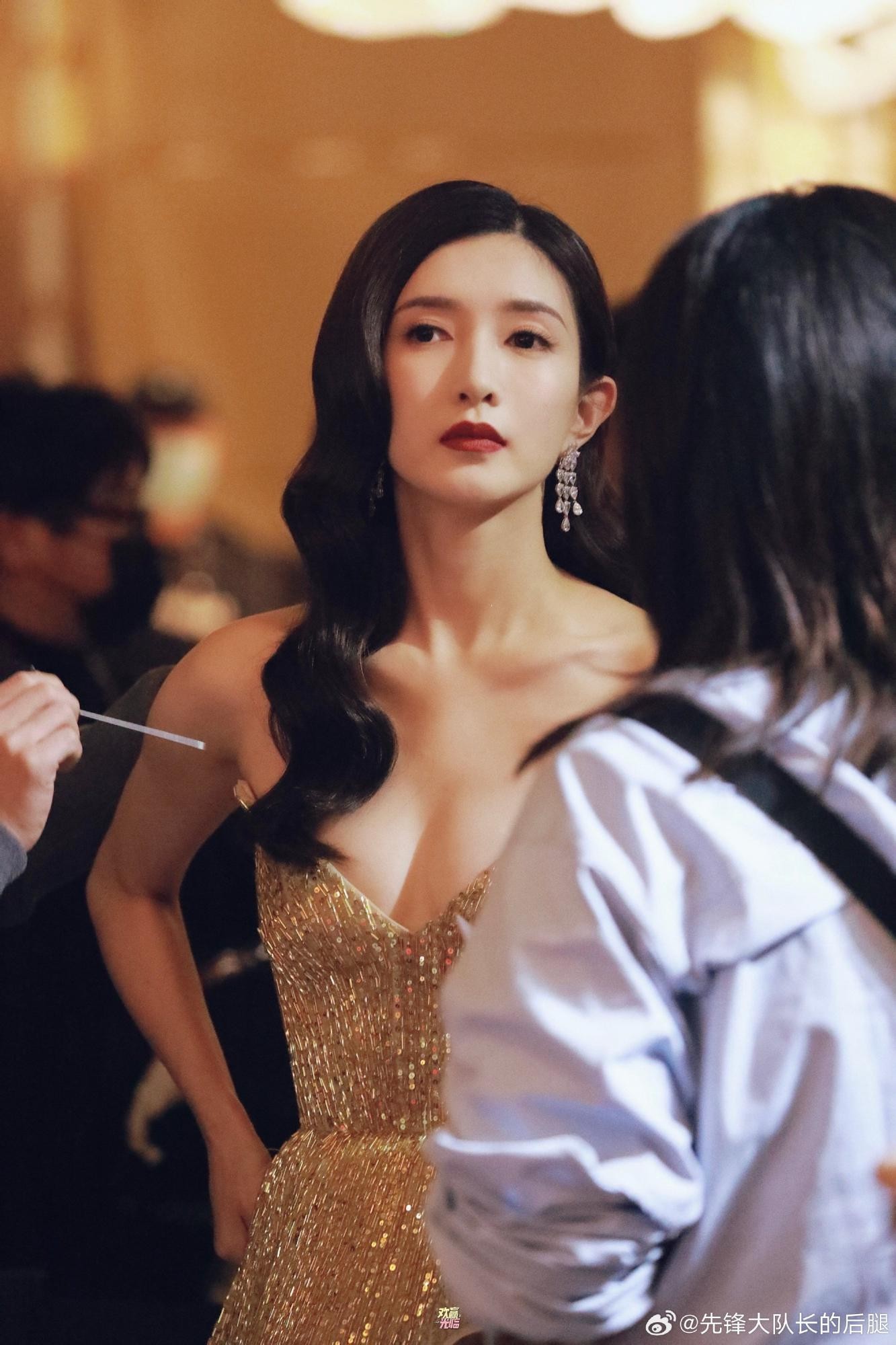 这袭礼服的设计堪称精妙。经典的抹胸剪裁,堪称江疏影展现身材优势的“利器”,它毫无保留地凸显出她如天鹅般优雅纤长的肩颈线条与精致的锁骨。一抹红唇与礼服的金色形成强烈的视觉对比,不仅提升了面部的立体感,更赋予了她一种明媚而具辨识度的气质。这种“锁骨在跳舞”般的魅力,正是抹胸礼服在她身上所能达到的极致效果。