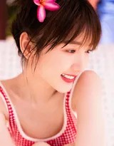 这组写真的造型堪称点睛之笔。毛晓彤选择了充满复古与俏皮感的红白格纹泳衣,搭配上标志性的“哪吒头”双丸子发型,并在发间别上一朵醒目的红色小花。这个造型细节立刻让她显得亲切又可爱,充满了邻家女孩般的活力。齐刘海下,她的一双明眸清澈有神,时而直视镜头,时而微微侧目,顾盼生辉。